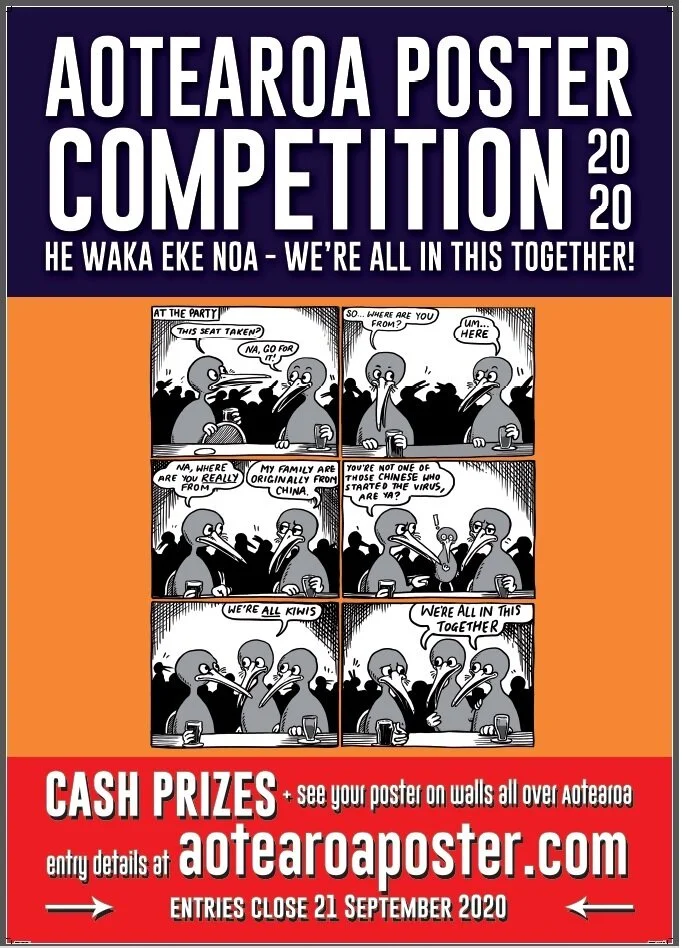 This competition launched on 10 August and ended with the Young Person, New and emerging artist, Established artist, and Popular Vote winners being announced by Meng Foon (Race Relations Commissioner) at the online prize-giving on Friday 30 October 2020. The four winning entrants each received $500 and their four posters were on street display nationwide (sponsored by Phantom Billstickers). The panel of judges: Mark Amery, Lynda Chanwai-Earl, Kerry Ann Lee, and Michel Tuffery selected winning entries (apart from for the Popular Vote) and also chose four Highly commended finalists. The announcement of the winning entrants and their comments as well as the finalist entries are presented below.